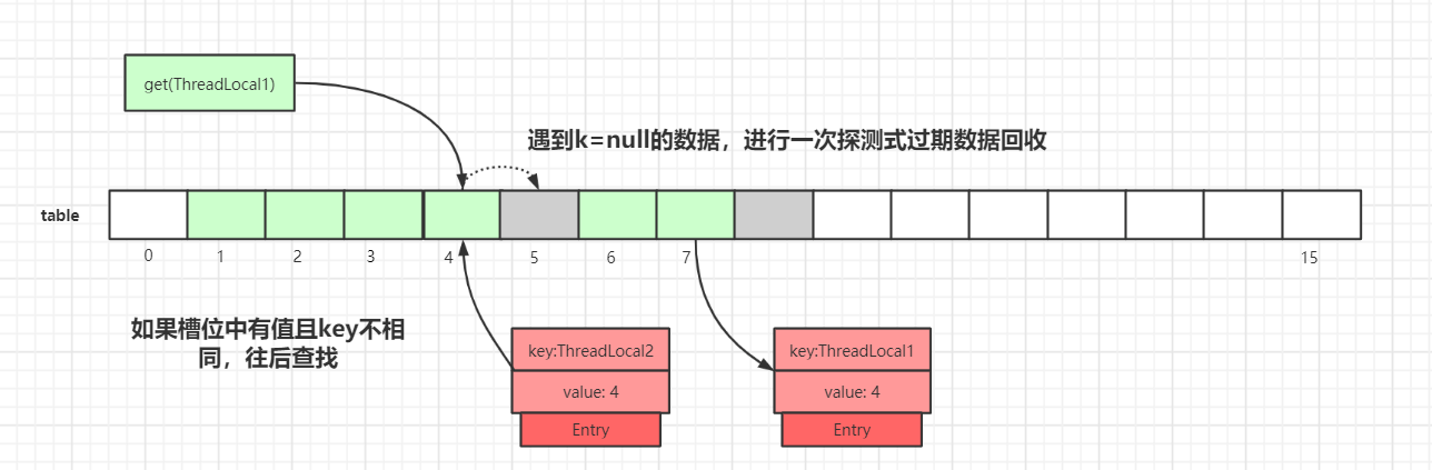 探测式清理是以当前Entry 往后清理,遇到值为null则结束清理,属于线性探测清理。