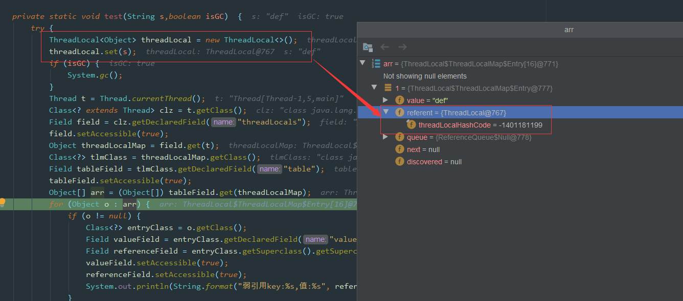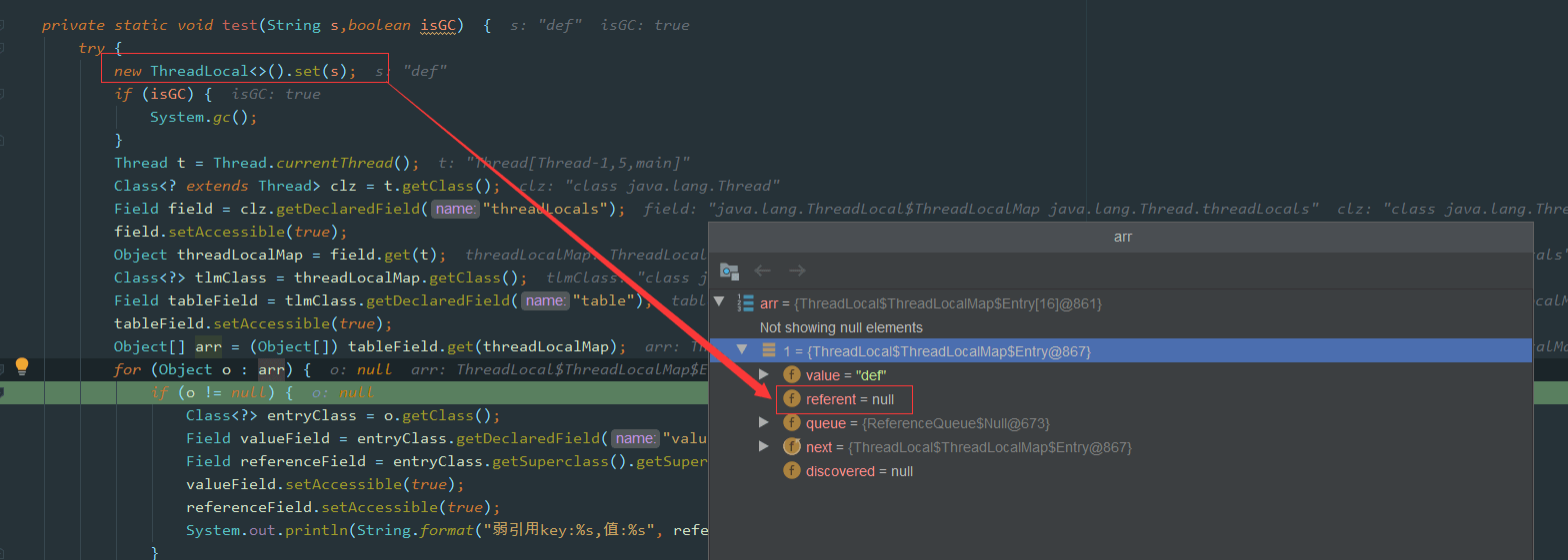 所以这里在GC之后,key就会被回收,我们看到上面debug中的referent=null, 如果改动一下代码: