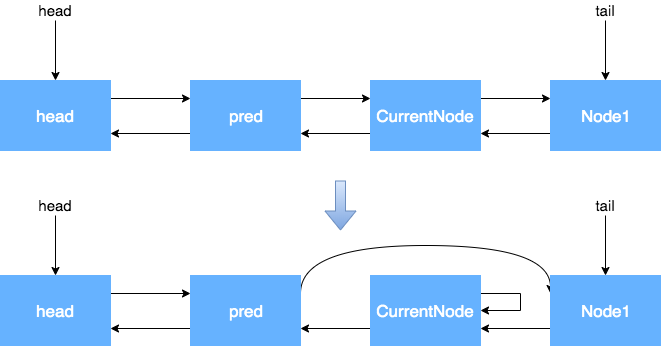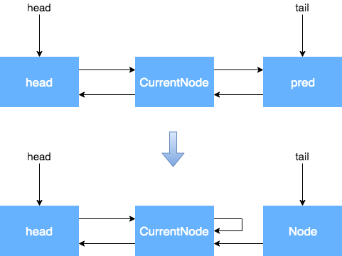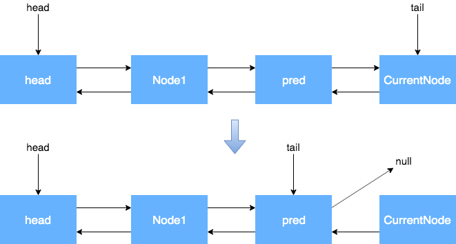 我们从这里可以看到,节点入队并不是原子操作,也就是说,node.prev = pred; compareAndSetTail(pred, node) 这两个地方可以看作 Tail 入队的原子操作,但是此时 pred.next = node;还没执行,如果这个时候执行了 unparkSuccessor 方法,就没办法从前往后找了,所以需要从后往前找。还有一点原因,在产生 CANCELLED 状态节点的时候,先断开的是 Next 指针,Prev 指针并未断开,因此也是必须要从后往前遍历才能够遍历完全部的 Node。