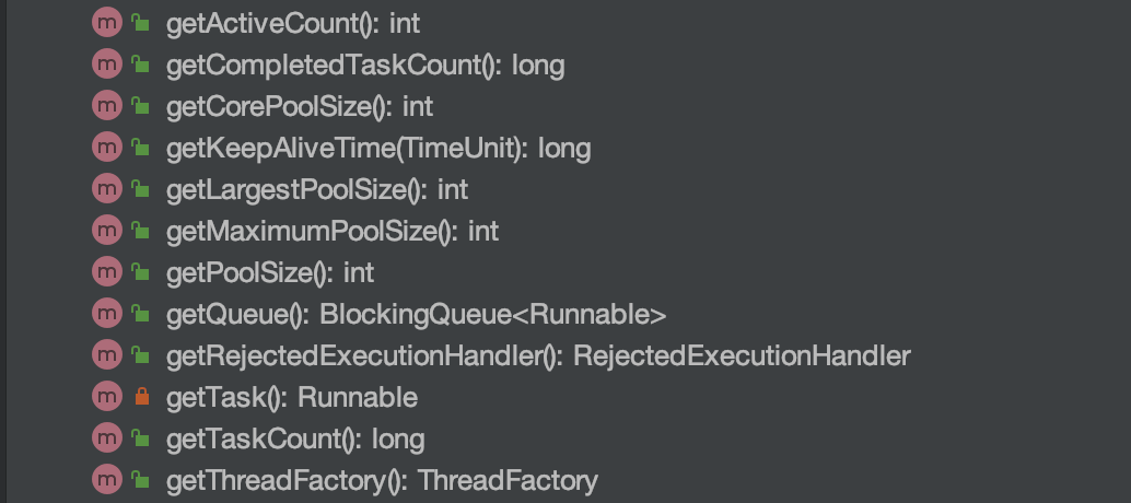 除此之外,我们还可以利用 ThreadPoolExecutor 的相关 API 做一个简陋的监控。从下图可以看出, ThreadPoolExecutor提供了获取线程池当前的线程数和活跃线程数、已经执行完成的任务数、正在排队中的任务数等等。