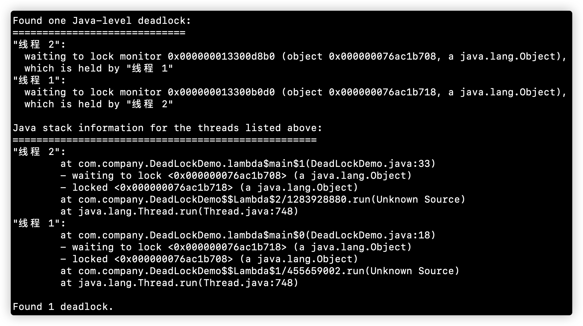 jmap、jstack等命令查看 JVM 线程栈和堆内存的情况。如果有死锁,jstack 的输出中通常会有 Found one Java-level deadlock:的字样,后面会跟着死锁相关的线程信息。另外,实际项目中还可以搭配使用top、df、free等命令查看操作系统的基本情况,出现死锁可能会导致 CPU、内存等资源消耗过高。