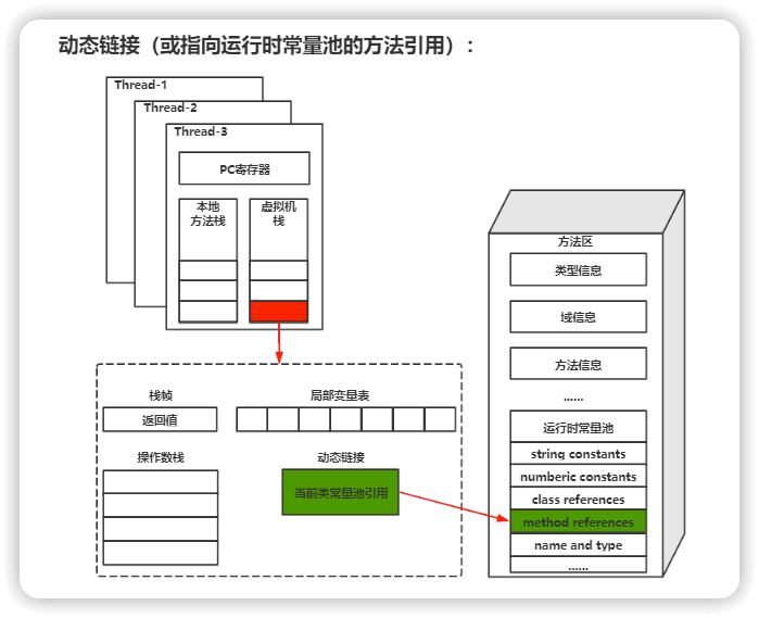 动态链接 主要服务一个方法需要调用其他方法的场景。Class 文件的常量池里保存有大量的符号引用比如方法引用的符号引用。当一个方法要调用其他方法,需要将常量池中指向方法的符号引用转化为其在内存地址中的直接引用。动态链接的作用就是为了将符号引用转换为调用方法的直接引用,这个过程也被称为 动态连接 。
