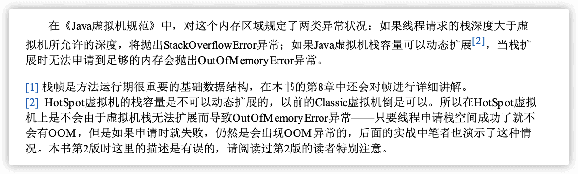 除了 StackOverFlowError 错误之外,栈还可能会出现OutOfMemoryError错误,这是因为如果栈的内存大小可以动态扩展, 那么当虚拟机在动态扩展栈时无法申请到足够的内存空间,则抛出OutOfMemoryError异常。