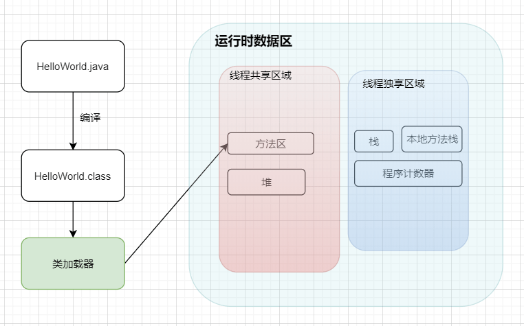 - 字节码文件通过类加载器被搬运到 JVM 虚拟机中