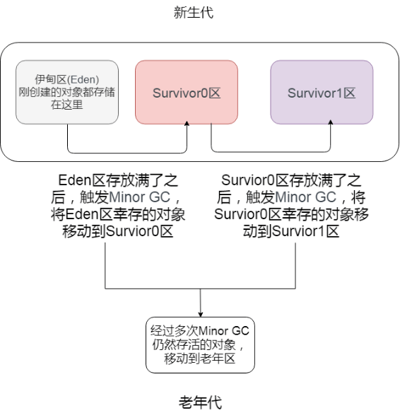 JVM 内存会划分为堆内存和非堆内存,堆内存中也会划分为年轻代和老年代,而非堆内存则为永久代。年轻代又会分为Eden和Survivor区。Survivor 也会分为FromPlace和ToPlace,toPlace 的 survivor 区域是空的。Eden,FromPlace 和 ToPlace 的默认占比为 8:1:1。当然这个东西其实也可以通过一个 -XX:+UsePSAdaptiveSurvivorSizePolicy 参数来根据生成对象的速率动态调整