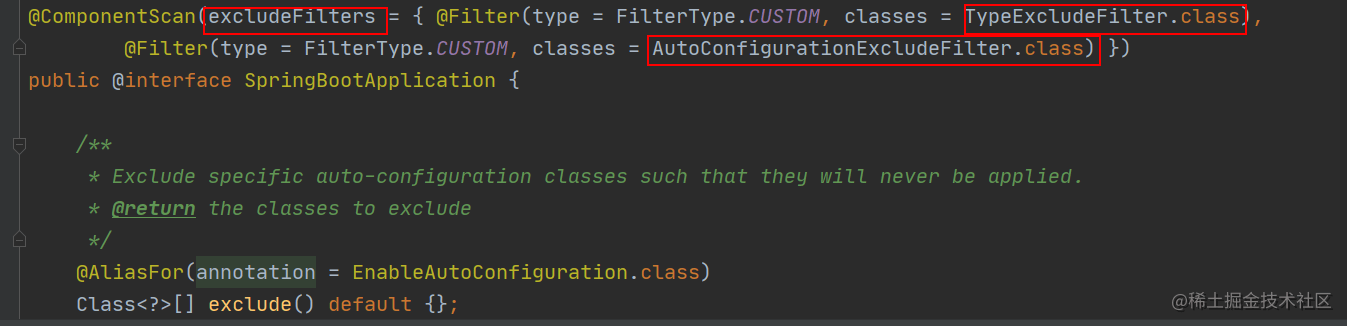 @ComponentScan:扫描被@Component (@Service,@Controller)注解的 bean,注解默认会扫描启动类所在的包下所有的类 ,可以自定义不扫描某些 bean。如下图所示,容器中将排除TypeExcludeFilter和AutoConfigurationExcludeFilter。