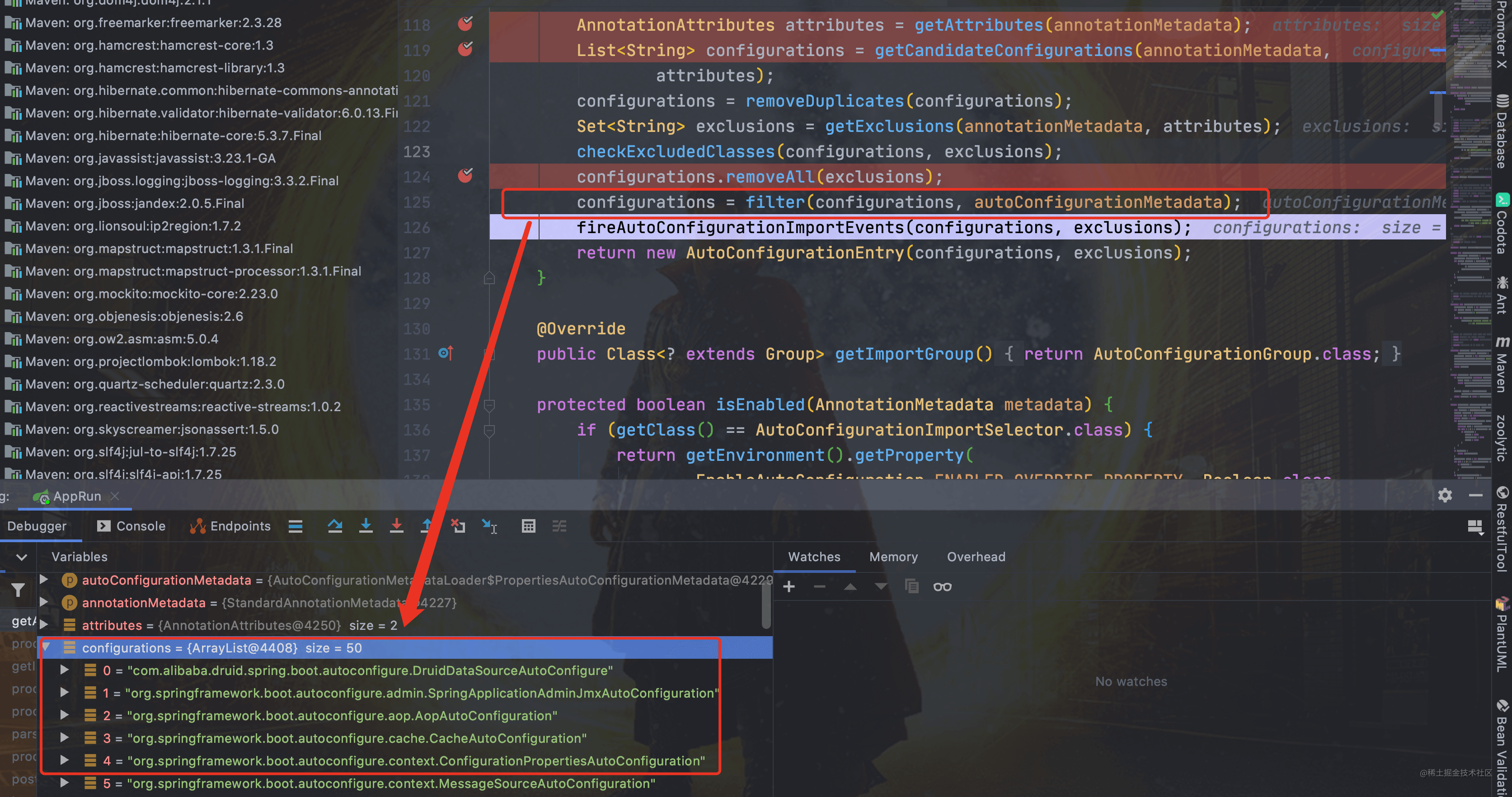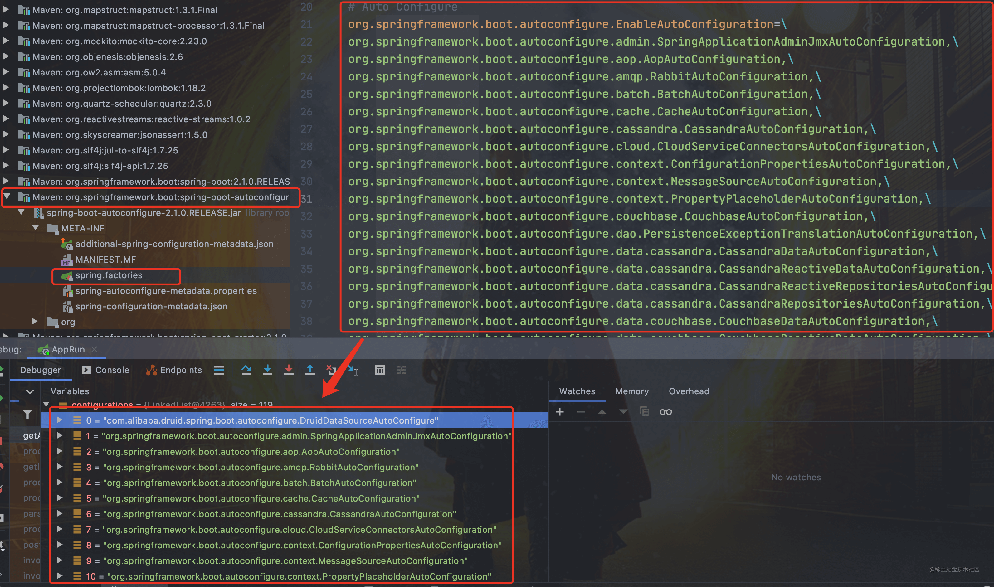 从下图可以看到这个文件的配置内容都被我们读取到了。XXXAutoConfiguration的作用就是按需加载组件。