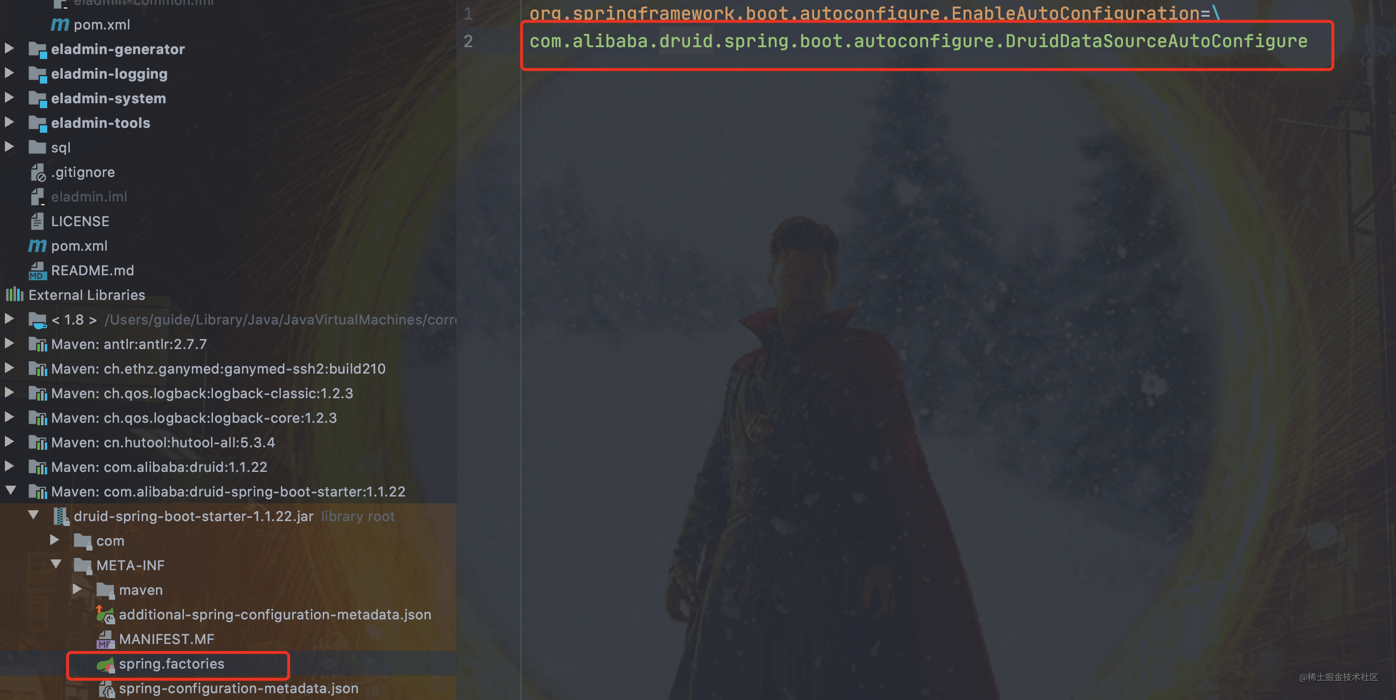 所以,你可以清楚滴看到, druid 数据库连接池的 Spring Boot Starter 就创建了META-INF/spring.factories文件。